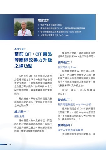 14專欄文章 2當前 QIT,CIT 醫品等團隊改善力升級之練功點TCIA目前QIT、CIT等團隊之改善力已達相當之水準(特別獲得金塔獎肯定支團隊)。展望未來如何讓團隊之改善力再次提升?如何練就AI世代解決複雜問題,實現複雜課題之重要能力?藉此機會,筆者就目前現審及書面報告所見之現況,整理出七項共同之練功點如下:練功點一:選對主題選有價值,有一定複雜度,而且急不來之問題或課題為專題,如此才得以提升機構之實力,練就解決複雜問題,或實現複雜課題之能力。簡單型之問題、課題則經由改善提案或直接對策PDCA進行改善即可。練功點二:現況分析之 Plan解複雜問題之Key在於現況分析(D2),所以針對複雜型之主題,應先確立現況分析之問題點假設及層別因子,再選定待釐清之層別因子,確定數據來源以及分析方法。切 記, 現 況 分 析 不 能 觸 及Why!!練功點三:針對問題點進行 Why-Why 分析應針對現況分析(D2)後所釐清之問題「點」,進行Why-Why原因分析,不宜直接以問題進入Why-Why分析,兩者差別很大!!練功點四:確立因果關係及影響度真因驗證力求確立因果關係,確詹昭雄中原大學兼任講師 ( 目前 )臺灣持續改善競賽(TCIA)、醫策會醫療品質獎評審曾任世曜國際品質專業顧問 ( 股 ) 公司 總經理台灣飛利浦電子公司 Dep’t Head