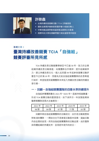 16許聰鑫台灣持續改善競賽活動(TCIA)評審委員國家品質獎評審會委員暨評審小組副召集人中華民國品質學會卓越經營品質獎主任委員南開科技大學校務顧問暨行銷流通管理系教授臺灣持續改善競賽 TCIA「自強組」競賽評審所見所感專欄文章 3TCIA持續改善活動競賽舉辦至今已逾30年,致力於企業組織持續改善活動推進,培養團隊合作精神,提升組織競爭力,建立持續改善文化。個人從民國94年起參與競賽活動評審至今正好滿20年,受邀為文就自強組競賽團隊的改善案進行剖析,希望能提供競賽團隊未來投入持續改善活動的持續改善引導。一、回顧-自強組競賽團隊的改善水準持續提升自強組參賽團隊數在2021年~2025年一直維持相當數量,形成TCIA競賽活動的重要基石,如下表所示。科技製造業與醫療業團隊是兩大主軸業別。2021年2022年2023年2024年2025年98隊84隊87隊77隊83隊回顧早期自強組競賽團隊的活動狀況,由於是活動資歷相對較淺的團隊,一開始往往不易掌握活動基本架構,遑論活動內容品質的呈現。然而自強組競賽團隊的活動品質,由於圈隊與母體組織的持續支持,呈現逐年提升的狀況。