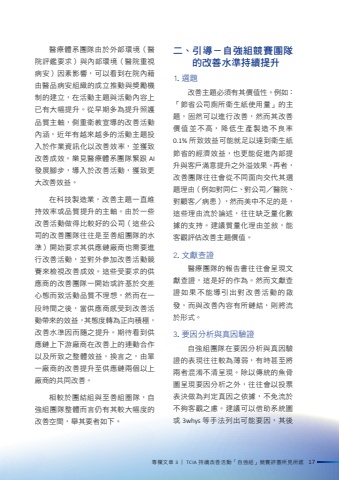17醫療體系團隊由於外部環境(醫院評鑑要求)與內部環境(醫院重視病安)因素影響,可以看到在院內藉由醫品病安組織的成立推動與獎勵機制的建立,在活動主題與活動內容上已有大幅提升。從早期多為提升照護品質主軸,側重衛教宣導的改善活動內涵,近年有越來越多的活動主題投入於作業資訊化以改善效率,並獲致改善成效。樂見醫療體系團隊緊跟AI發展腳步,導入於改善活動,獲致更大改善效益。在科技製造業,改善主題一直維持效率或品質提升的主軸。由於一些改善活動做得比較好的公司(這些公司的改善團隊往往是至善組團隊的水準)開始要求其供應鏈廠商也需要進行改善活動,並對外參加改善活動競賽來檢視改善成效。這些受要求的供應商的改善團隊一開始或許基於交差心態而致活動品質不理想,然而在一段時間之後,當供應商感受到改善活動帶來的效益,其態度轉為正向積極,改善水準因而隨之提升。期待看到供應鏈上下游廠商在改善上的連動合作以及所致之整體效益,換言之,由單一廠商的改善提升至供應鏈兩個以上廠商的共同改善。相較於團結組與至善組圈隊,自強組團隊整體而言仍有其較大幅度的改善空間,舉其要者如下。二、引導-自強組競賽團隊的改善水準持續提升1. 選題改善主題必須有其價值性。例如:「節省公司廁所衛生紙使用量」的主題,固然可以進行改善,然而其改善價值並不高,降低生產製造不良率0.1%所致效益可能就足以達到衛生紙節省的經濟效益,也更能促進內部提升與客戶滿意提升之外溢效果。再者,改善團隊往往會從不同面向交代其選題理由(例如對同仁、對公司/醫院、對顧客/病患),然而美中不足的是,這些理由流於論述,往往缺乏量化數據的支持。建議質量化理由並敘,能客觀評估改善主題價值。2. 文獻查證醫療團隊的報告書往往會呈現文獻查證,這是好的作為。然而文獻查證如果不能導引出對改善活動的啟發,而與改善內容有所鏈結,則將流於形式。3. 要因分析與真因驗證自強組團隊在要因分析與真因驗證的表現往往較為薄弱,有時甚至將兩者混淆不清呈現。除以傳統的魚骨圖呈現要因分析之外,往往會以投票表決做為判定真因之依據,不免流於不夠客觀之慮。建議可以借助系統圖或3whys等手法列出可能要因,其後專欄文章3TCIA持續改善活動「自強組」競賽評審所見所感