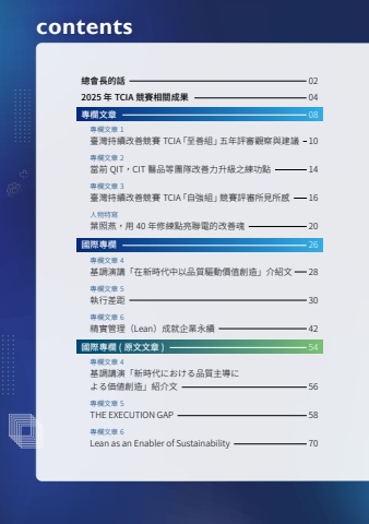 contents總會長的話022025 年 TCIA 競賽相關成果04專欄文章08專欄文章 1 臺灣持續改善競賽 TCIA「至善組」五年評審觀察與建議10專欄文章 2 當前 QIT,CIT 醫品等團隊改善力升級之練功點14專欄文章 3 臺灣持續改善競賽 TCIA「自強組」競賽評審所見所感16人物特寫 葉照燕,用 40 年修練點亮聯電的改善魂20國際專欄26專欄文章 4 基調演講「在新時代中以品質驅動價值創造」介紹文28專欄文章 5 執行差距30專欄文章 6 精實管理(Lean)成就企業永續42國際專欄 ( 原文文章 )54專欄文章 4 基調講演「新時代における品質主導に よる価値創造」紹介文56專欄文章 5 THE EXECUTION GAP58專欄文章 6 Lean as an Enabler of Sustainability70