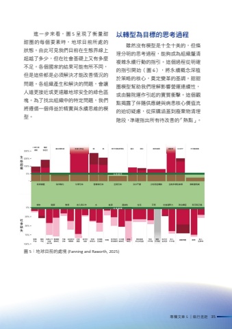 35進一步來看,圖5呈現了衡量甜甜圈的每個要素時,地球目前所處的狀態。由此可見我們目前在生態界線上超越了多少,但在社會基礎上又有多麼不足。各個國家的結果可能有所不同,但是這些都是必須解決才能改善情況的問題。各組織產生和解決的問題,會讓人道更接近或更遠離地球安全的綠色區塊。為了找出組織中的特定問題,我們將遵循一個得益於精實與永續思維的模型。以轉型為目標的思考過程雖然沒有模型是十全十美的,但條理分明的思考過程,能夠成為組織釐清複雜永續行動的指引。這個過程從明確的指引開始(圖6),將永續概念深植於策略的核心,奠定變革的基調。甜甜圈模型幫助我們理解影響營運連續性,或由醫院運作引起的實質衝擊。這個觀點揭露了伴隨供應鏈與病患核心價值流的迫切疑慮,從採購涵蓋到廢棄物清理階段,準確指出所有待改善的「熱點」。圖5:地球目前的處境(Fanning and Raworth, 2025)專欄文章5|執行差距生態超載社會缺失二氧化碳濃度營養不良糧食不足不識字率社會貧困五歲以下兒童死亡率醫療服務缺乏未完成中學教育危險衛生設施室內缺乏潔淨燃料貧民窟或非正式住居公共運輸缺乏性別不平等種族不平等缺乏社會支持收入不平等殺人犯罪率威權政體腐敗網路缺乏缺電青年尼特族危險飲用水氣候變遷食物健康教育收入與工作水能源連結性住宅平等社會凝聚力政治聲音和平與正義海洋酸化化學污染營養物污染空氣污染淡水干擾土地用途轉換生物多樣性破壞臭氧層耗竭輻射強迫力有毒化學品磷氮跨半球氣膠微粒藍水綠水森林面積滅絕率HANPP平流層臭氧生態邊界社會基礎霰石飽和度