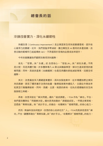2總會長的話持續改善(Continuous Improvement)是企業面對全球快速變遷環境、提升核心競爭力的關鍵。近年,我們面臨淨零減碳、數位轉型及 AI 應用的多重挑戰,改善活動的範疇早已超越傳統QCC,不再僅限於現場的品質或效率提升。今年的競賽讓我們觀察到幾項深刻趨勢:首先,「智慧」與「永續」成 改善核心。「智能/AI」與「綠色永續」不再是口號,而是具體行動。許多團隊導入AI算法與機器學習,解決生產與管理的複雜問題;同時,高碳排產業(如鋼鐵業)也看見具體的節能減碳專案,回應全球趨勢。其次,改善廣度深入關鍵產業體系。高科技製造業中,從半導體指標企業到其供應鏈,展現了體系攜手改善的能量。醫療服務業持續投入,主題從作業效率拓展至行動醫療創新。同時,高鐵、北捷、桃捷的參與,也為交通運輸的安全與服務樹立典範。再者,改善深度從「解決問題」邁向「達成課題」。TCIA作為「練功」平台,我們看到團隊從「問題解決型」邁向更具挑戰的「課題達成型」,呼應企業策略,並透過「專業知識」與「統計手法」的融合,培養解決「複雜問題」的核心能力。然而,無論科技如何進步,改善的核心始終在於「人」。TCIA的真諦是提供「練功」平台,讓團隊融合「專業知識」與「統計手法」,培養解決「複雜問題」的能力。淬鍊改善實力,深化永續韌性
