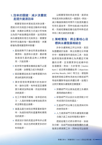 431.效率的關鍵:減少浪費就是提升資源效率精實管理的本質就是消除浪費,透過分析流程區分增值活動和非增值活動,其最終目標是力求減少所有無法為客戶創造價值的環節。這項原則與永續發展的理念完美契合,精實管理中所定義的每一種浪費類型,其實都會為環境層面帶來影響:產能過剩不只會佔用資金還會浪費原料、能源和水資源,最終導致過度生產的產品無人消費使用,只能丟棄。耗時等待會導致機械設備不必要的空轉,浪費電力或冷熱資源。遠距離運送就表示會需要額外的燃油耗損和排放量。庫存管理則需要額外的包裝材料、儲存空間,有時候甚至還需要冷藏或加熱設備,而這些都會消耗資源。在工作環境不順暢、效率低的地方,人員的移動也會增加能源消耗並導致產品損傷。當產品產生缺陷並需要重新製作時,為達到相同的產量需耗費兩倍的資源。過度設計指的是產品帶有非必要的功能,如此也將耗費更多的材料和能源。以精實管理的角度來看,資源效率就是消除浪費的另一個面向。例如,減少機器換模的時間不只能提高靈活性和生產效率,同時也能減少能源消耗,而縮短運輸距離也能同時降低成本和二氧化碳的排放量。2.策略實施:將企業核心目標與永續發展相結合許多永續策略之所以失敗,是因為整體過於抽象,無法落實在日常運作中。精實管理所提供的工具,則是能將高階的願景轉化為具體且可衡量的目標,並落實貫穿在組織中的各個層面。例如:方針管理(Hoshin Kanri)或目標與關鍵結果(Objectives and Key Results, OKR)等方法,都能夠確保將策略目標有系統地分解成部門等級和團隊等級的具體目標。這種方法對於實踐永續發展至關重要:採購部門可以肩負起建立永續供應商網絡的責任。研發部門可以設計出使用較少材料或易於回收的產品。生產部門可以專注在能源與材料的使用效率。人力資源部門可將永續發展的觀念融入員工培訓和發展計劃中。透過這種方式將目標內容,按級別分解,各部門就能根據整體的永續發展目標展開工作,同時也可以依照專欄文章6|精實管理(Lean)成就企業永續