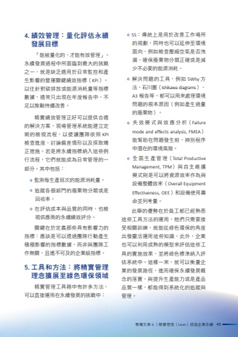 454.績效管理:量化評估永續發展目標「能被量化的,才能有效管理」。永續發展過程中所面臨到最大的挑戰之一,就是缺乏適用於日常監控和產生影響的營運關鍵績效指標(KPI)。以往針對碳排放或能源消耗量等指標數據,通常只出現在年度報告中,不足以推動持續改善。精實績效管理正好可以提供合適的解決方案,現場管理系統能建立定期的檢視流程,以便讓團隊依照KPI檢查進度、討論偏差情形以及採取矯正措施。若是將永續指標納入這些例行流程,它們就能成為日常管理的一部分。其中包括:監測每生產班次的能源消耗量。追蹤各個部門的廢棄物分類或是回收率。在評估成本與品質的同時,也檢視供應商的永續績效評分。關鍵在於定義那些具有影響力的指標:應該是可以透過團隊行動產生積極影響的指標數據,而非與團隊工作無關,且遙不可及的企業級指標。5.工具和方法:將精實管理理念擴展至綠色環保領域精實管理工具箱中有許多方法,可以直接運用在永續發展的挑戰中: 5S:傳統上是用於改善工作場所的規劃,同時也可以延伸至環境面向,例如檢查壓縮空氣是否洩漏、確保廢棄物分類正確或是減少不必要的能源消耗。解決問題的工具,例如5Why方法、石川圖(Ishikawa diagrams)、A3報告等,都可以用來處理環境問題的根本原因(例如產生過量的廢棄物)。失 效 模 式 與 效 應 分 析(Failure mode and effects analysis, FMEA)能幫助在問題發生前,辨別程序中潛在的環境風險。全 面 生 產 管 理(Total Productive Management, TPM)與自主維護模式則是可以將資源效率作為與設備整體效率(Overall Equipment Effectiveness, OEE)和設備使用壽命並列考量。此舉的優勢在於員工都已經熟悉這些工具方法的運用,他們只需要接受相關訓練,就能從綠色環保的角度出發靈活運用這些知識。此外,企業也可以利用成熟的模型來評估這些工具的實施效果,並將綠色標準納入評估系統中。這樣一來,就可以衡量企業的發展路徑,進而確保永續發展概念的落實,與提升生產能力或是產品品質一樣,都能得到系統化的追蹤與管理。專欄文章6|精實管理(Lean)成就企業永續