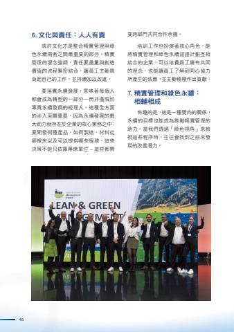 466.文化與責任:人人有責或許文化才是整合精實管理與綠色永續兩者之間最重要的部分。精實管理的理念強調,責任要盡量與創造價值的流程緊密結合,讓員工主動肩負起自己的工作,並持續加以改進。要落實永續發展,意味著每個人都會成為轉型的一部分—而非僅限於專責永續發展的經理人。這種全方面的涉入至關重要,因為永續發展的最大助力就存在於企業的核心業務之中:要開發何種產品、如何製造、材料從哪裡來以及可以提供哪些服務。這些決策不能只依靠幕僚單位這些都需要跨部門共同合作承擔。培訓工作也扮演著核心角色,能將精實管理和綠色永續認證計劃互相結合的企業,可以培養員工擁有共同的理念,也能讓員工了解到同心協力所產生的效應,並主動積極作出貢獻。7.精實管理和綠色永續:相輔相成有趣的是,這是一種雙向的關係,永續的目標也能成為推動精實管理的助力。當我們透過「綠色視角」來檢視這些程序時,往往會找到之前未發現的改善潛力。