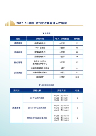 ▼ 全景圖系列別課程名稱課程日期時數持續改善QC 手法活用演練03/26(四)Q10107/02(四)Q20109/03(四)Q3016新 QC 七手法活用演練04/09(四)Q10207/16(四)Q20209/10(四)Q3026問題解決型改善步驟培訓04/23(四)Q10307/30(四)Q20309/17(四)Q3036▼ 各系列課程明細階段課程系列場次 / 課程數量總時數基礎修鍊持續改善系列6 堂課36改善技術TPS 4 級檢定3 堂課18精實改善系列6 堂課36設備管理系列3 堂課18數位管理台達 & NVIDIA虛實整合學習中心5 堂課30交流活動持續改善專題及說明會1 場次6持續改善案例解析3 場次6海外研習2 場次10 天2025 CI 學院 全方位改善管理人才培育