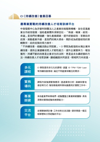 CI(持續改善)會員召募最專業實戰的持續改善人才培育訓練平台中衛發展中心為非營利財團法人之產業技術服務機構,旨在促進產業合作綜效發展,協助產業體系深耕茁壯。「熱誠、精業、綜效、卓越」是我們的價值觀,強化產業網絡,提升經營綜效;落實政府政策,推動產業升級,是我們的兩大使命,期許成為經營綜效的策略夥伴、政府政策的得力推手。「不持續改善,組織活路必然阻塞」。CI 學院為能協助台灣企業持續改善,提供企業建構培育人才韌性能力,提升企業競爭力,增加獲利,持續不斷的改善是企業求生的法則,更是追求永續經營的方法。持續改善人才培育訓練,讓組織說共同語言,朝相同方向前進。多元課程CI 學院提供多元化的課程,涵蓋 IE、TPM、TQM、Lean 等持續改善領域,滿足不同產業和職位的需求。實務導向課程內容強調實務應用,透過案例分析、演練和實地參訪等方式,幫助學員將所學知識應用於實際工作中。專業師資來自產業界和學術界,經驗豐富之專業師資團隊,具有深厚的實務經驗和教學能力。交流平台定期舉辦研討會、工作坊和交流活動,提供學員一個互相學習和分享經驗的平台。