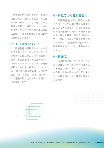 專欄文章4 (原文)|基調講演「新時代における品質主導による価値創造」紹介文57ーズを徹底的に問い直すことで時代に合った姿へ進化しました。さらにWoven City は、人中心の街づくりを実証する新たな挑戦です。これらはすべて、コツコツと改善を積み重ねる姿勢と、未来を見据えた価値創造の結果といえます。3.トヨタの人づくり価値創造の原動力となっているトヨタの「人づくり」について、その考え方と取り組みについて紹介します。豊田綱領にその起源を持つトヨタのビジョン・ミッションや行動規範、さらにその推進力となっている TQM(統合的品質管理)について紹介します。その一例とし QC サークル活動を取り上げ、その本質について考察します。4.対話でつくる組織文化価値創造及びその源泉である「人づくり」を可能とする組織文化について考えます。「対話」は単なる会話や議論とは異なり、結論を急がず、互いを尊重し聴き合う営みです。「対話」によって職場が充実するだけでなく、危機を乗り越えたり、価値創造を支えたりした事例を紹介します。4.最後に価値創造に向けて「人づくり」と「組織づくり」が不可欠であることを確認するとともに、QCサークル活動の生みの親である故石川馨先生の言葉を紹介して、講演を締めくくります。