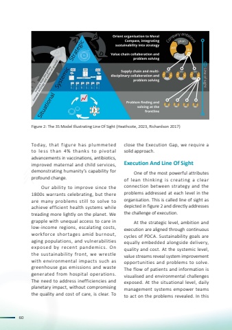 60Today, that f igure has plummeted to l e s s than 4% thank s to p i vot al advancements in vaccinations, antibiotics, improved maternal and child services, demonstrating humanity’s capability for profound change. Our ability to improve since the 1800s warrants celebrating, but there are many problems still to solve to achieve efficient health systems while treading more lightly on the planet. We grapple with unequal access to care in low-income regions, escalating costs, workforce shor tages amid burnout, aging populations, and vulnerabilities exposed by recent pandemic s. On the sustainability front, we wrestle with environmental impacts such as greenhouse gas emissions and waste generated from hospital operations. The need to address inefficiencies and planetary impact, without compromising the quality and cost of care, is clear. To close the Execution Gap, we require a solid approach.Execution And Line Of SightOne of the most powerful attributes of lean thinking is creating a clear connection between strategy and the problems addressed at each level in the organisation. This is called line of sight as depicted in figure 2 and directly addresses the challenge of execution.At the strategic level, ambition and execution are aligned through continuous cycles of PDCA. Sustainability goals are equally embedded alongside delivery, quality and cost. At the systemic level, value streams reveal system improvement opportunities and problems to solve. The flow of patients and information is visualised and environmental challenges exposed. At the situational level, daily management systems empower teams to act on the problems revealed. In this Figure 2: The 3S Model Illustrating Line Of Sight (Heathcote, 2023, Richardson 2017)