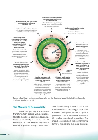 62Hospitals drive emissions through energy use, supply chains, and waste incineration.Audit and optimise energy efficiency in facilities. Pursue carbon neutrality and cut waste such as transport.Carbon emissions affect marine biodiversity loss.Cut fossil fuel reliance.Support ocean-friendly supply chains.Anaesthetic gases may contribute to ozone-damaging emissions,similar to CFCs.Switch to low-impact alternatives. Train staff on gas capture systems. Phase out high-GWP gases through policy advocacy and R&D for eco-friendly anaesthetics.Pharmaceuticals and disinfectants pollute waterways, harming aquatic life.Investigate green chemistry, drug take-back programs and develop biodegradable alternatives and advanced wastewater treatment.High water use in cooling, sanitation, and laundry, especially applicable in water-scarce areas.Efficiency upgrades. Install low-flow fixtures and recycle grey-water. Integrate rainwater harvesting and advocate for conservation policies.Hospital expansions and waste landfills encroach on natural lands, fragmenting habitats.Reduce waste to improve existing capacity utilisation. Prioritise brownfield redevelopment. Conduct environmental impact assessments for new builds.Promote compact, vertical designs and urban greening initiatives.Fertiliser runoff from food farms and nitrogen-rich waste contributing to eutrophication. Food waste triggering more production.Evaluate menus and procurement practices to source cleaner options. Source from low-impact agriculture and treat wastewater to remove nitrates. Phosphate-free cleaners.Reduce food waste.Pharmaceutical waste contaminating ecosystems, and supply chains driving habitat destruction.Sourcing from cleaner supply chains and waste management. Proper categorisation and disposal of hazardous waste. Partner with suppliers for biodiversity-friendly practices and reduce single-use plastics.Hospital operations release particulate matter, nitrous oxide, and sulphur oxide from energy generation and vehicle fleets, exacerbating respiratory issues.Adopt clean energy and zero-emission transport and fleets. Install air filters and integrate green building standards to minimise on-site pollution.The Meaning Of SustainabilityThe learning journey of sustainable transformation begins with education. Climate change has dominated agendas, but sustainabilit y is a complex and evolving topic, that extends beyond the effects of greenhouse gas emissions. True sustainability is both a social and environmental challenge, and Kate Raworth’s Doughnut Model in figure 4 provides a holistic framework to envision the multidimensional transition. The model describes both the environmental limits to respect and the social essentials Figure 4: Healthcare environmental examples and the Doughnut Model (Adapted from Raworth, 2017 and Heathcote, 2023)