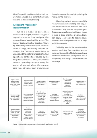 64identify specific problems in institutions, we follow a model that benefits from both lean and sustainability thinking.A Thought Process For TransformationW h i l e n o m o d e l i s p e r f e c t , a structured thought-process can guide organisations as they navigate the complexities of sustainability action. The journey begins with clear direction (figure 6), embedding sustainability into the heart of the strategy, and setting the tone for change. The Doughnut Model helps to understand the material impacts affecting operational continuity or caused by the hospital operations. This perspective uncovers pressing concerns along the supply chain and along the patient care value streams, from procurement through to waste disposal, pinpointing the “hotspots” to improve.Mapping patient journeys and the resources consumed along the way, or the development of detailed life cycle assessments may present deeper insights. These may reveal opportunities as shown in table 1. Once priorities are clear, teams can apply lean tools to tackle issues methodically through iterative PDCA loops and Kaizen events.Guided by a model for transformation, leaders inevitably face questions around costs and the upside of building sustainable healthcare institutions. An important part of the journey is crafting a solid business case for change.Table 1: Potential Improvement Examples (Heathcote, 2023)