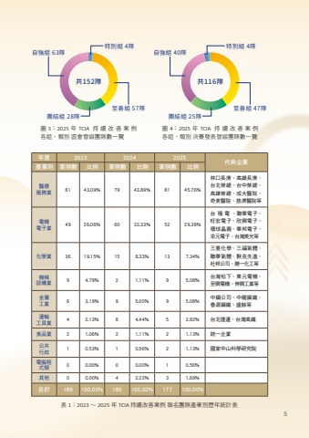 5圖4:2025年TCIA 持續改善案例各組、類別決賽發表晉級團隊數一覽圖3:2025年TCIA 持續改善案例各組、類別區會晉級團隊數一覽表1:2023~2025年TCIA 持續改善案例報名團隊產業別歷年統計表共116隊自強組 40隊特別組 4隊至善組 47隊團結組 25隊年度202320242025代表企業產業別案例數比例案例數比例案例數比例醫療服務業8143.09%7943.89%8145.76%林口長庚、高雄長庚、台北榮總、台中榮總、高雄榮總、成大醫院、奇美醫院、慈濟醫院等電機電子業4926.06%6033.33%5229.38%台 積 電 、聯華電子、旺宏電子、欣興電子、環球晶圓、華邦電子、京元電子、台灣美光等化學業3619.15%158.33%137.34%三菱化學、三福氣體、聯華氣體、默克先進、杜邦公司、勝一化工等機械設備業94.79%21.11%95.08%台灣松下、東元電機、至興電機、伸興工業等金屬工業63.19%95.00%95.08%中鋼公司、中龍鋼鐵、春源鋼鐵、盛餘等運輸工具業42.13%84.44%52.82%台北捷運、台灣高鐵食品業21.06%21.11%21.13%統一企業公共行政10.53%10.56%21.13%國家中山科學研究院電腦程式類00.00%00.00%10.56%其他00.00%42.22%31.69%合計188100.00%180100.00%177100.00%共152隊自強組 63隊特別組 4隊至善組 57隊團結組 28隊