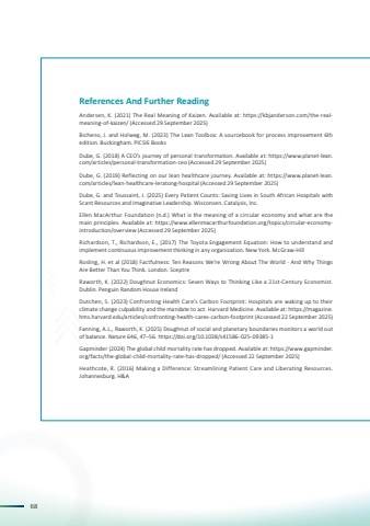 68References And Further ReadingAndersen, K. (2021) The Real Meaning of Kaizen. Available at: https://kbjanderson.com/the-realmeaning-of-kaizen/ (Accessed 29 September 2025)Bicheno, J. and Holweg, M. (2023) The Lean Toolbox: A sourcebook for process improvement 6th edition. Buckingham. PICSIE BooksDube, G. (2018) A CEO’s journey of personal transformation. Available at: https://www.planet-lean.com/articles/personal-transformation-ceo (Accessed 29 September 2025)Dube, G. (2019) Reflecting on our lean healthcare journey. Available at: https://www.planet-lean.com/articles/lean-healthcare-leratong-hospital (Accessed 29 September 2025)Dube, G. and Toussaint, J. (2025) Every Patient Counts: Saving Lives in South African Hospitals with Scant Resources and Imaginative Leadership. Wisconsen. Catalysis, Inc. Ellen MacArthur Foundation (n.d.) What is the meaning of a circular economy and what are the main principles. Available at: https://www.ellenmacarthurfoundation.org/topics/circular-economyintroduction/overview (Accessed 29 September 2025)Richardson, T., Richardson, E., (2017) The Toyota Engagement Equation: How to understand and implement continuous improvement thinking in any organization. New York. McGraw-Hill Rosling, H. et al (2018) Factfulness: Ten Reasons We're Wrong About The World - And Why Things Are Better Than You Think. London. SceptreRaworth, K. (2022) Doughnut Economics: Seven Ways to Thinking Like a 21st-Century Economist. Dublin. Penguin Random House Ireland Dutchen, S. (2023) Confronting Health Care’s Carbon Footprint: Hospitals are waking up to their climate change culpability and the mandate to act. Harvard Medicine. Available at: https://magazine.hms.harvard.edu/articles/confronting-health-cares-carbon-footprint (Accessed 22 September 2025)Fanning, A.L., Raworth, K. (2025) Doughnut of social and planetary boundaries monitors a world out of balance. Nature 646, 47–56. https://doi.org/10.1038/s41586-025-09385-1Gapminder (2024) The global child mortality rate has dropped. Available at: https://www.gapminder.org/facts/the-global-child-mortality-rate-has-dropped/ (Accessed 22 September 2025)Heathcote, R. (2016) Making a Difference: Streamlining Patient Care and Liberating Resources. Johannesburg. H&A