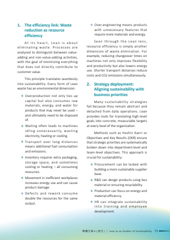專欄文章6 (原文)|Lean as an Enabler of Sustainability711.The efficiency link: Waste reduction as resource efficiencyA t i t s h e a r t , L e a n i s a b o u t eliminating was te. Pro ces ses are analyzed to distinguish between valueadding and non-value-adding activities, with the goal of minimizing everything that does not directly contribute to customer value.This principle translates seamlessly into sustainability. Every form of Lean waste has an environmental dimension: Overproduction not only ties up capital but also consumes raw materials, energy, and water for products that may never be used – and ultimately need to be disposed of. Waiting often leads to machines idling unnecessarily, wasting electricity, heating or cooling. Transport over long distances means additional fuel consumption and emissions. Inventory requires extra packaging, storage space, and sometimes cooling or heating – all consuming resources. Movement in inefficient workplaces increases energy use and can cause product damage. Defects and rework consume double the resources for the same output. Over-engineering means products with unnecessary features that require more materials and energy.S e e n t h r o u g h t h e L e a n l e n s , resource efficiency is simply another dimension of waste elimination. For example, reducing changeover times on machines not only improves flexibility and productivity but also lowers energy use. Shorter transport distances reduce costs and CO2 emissions simultaneously.2.Strategy deployment: Aligning sustainability with business prioritiesMany sustainability strategies fail because they remain abstract and detached from daily operations. Lean provides tools for translating high-level goals into concrete, measurable targets at every level of the organization.Methods such as Hoshin Kanri or Objectives and Key Results (OKR) ensure that strategic priorities are systematically broken down into department-level and team-level objectives. This approach is crucial for sustainability: Procurement can be tasked with building a more sustainable supplier base. R&D can design products using less material or ensuring recyclability. Production can focus on energy and material efficiency. HR can integrate sustainability i n t o t r a i n i n g a n d e m p l o y e e development.
