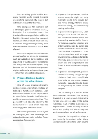 72By cascading goals in this way, every function works toward the same overarching sustainability targets but with levers relevant to their role.One company, for example, set a strategic goal to improve its CO₂ footprint. For production teams, this translated into energy-efficiency KPIs; for logistics, it meant optimizing transport routes; and for product development, it involved design for recyclability. Each contribution was different – but all were aligned.Lean also emphasizes harmonized annual cycles for strategic processes such as budgeting, target setting, and reporting. If sustainability milestones are integrated into these cycles, they become part of the same management rhythm as financial and operational goals – rather than an isolated side project.3.Process thinking: Looking across the value streamOne of Lean’s greatest strengths is its process orientation. Instead of looking at functions in isolation, Lean maps value streams across departments to identify bottlenecks, inefficiencies, and improvement opportunities. This perspective is equally powerful for sustainability – and often requires surprisingly little additional effort.Whenever processes are analyzed or redesigned, the same workshops and data collection can easily include a Green perspective. For example: In production processes, a value stream analysis might not only highlight cycle time issues but also reveal energy-intensive steps, excessive scrap, or unnecessary heating and cooling. In procurement processes, Lean analysis can make the end-toend flow more efficient while also uncovering sustainability levers. For instance, supplier selection and order handling can be optimized to reduce unnecessary transport, c o n s o l i d a t e s h i p m e n t s , a n d choose suppliers with stronger environmental and social standards. This way, procurement not only lowers cost and complexity but also drives a more sustainable supply chain. In product development, process reviews can bring to light design c h o i c e s t h at ove rco m p l i cate products or use unnecessary materials – opportunities to design for recyclability or lower carbon footprint.The advantage is clear: when improvement resources are already invested in a Lean project, integrating Green objec tives adds lit tle ex tra workload but creates significantly higher impact. Teams not only optimize costs and quality but also strengthen environmental and social performance.S u p p l i e r i n t e g r a t i o n p l a y s a par ticularly impor tant role. Many companies already extend Lean beyond