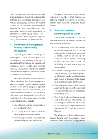 73their factory gates to harmonize supply chain processes. By adding sustainability to these joint workshops, companies can reduce packaging, optimize transport routes, or set common environmental standards. One manufac turer, for example, worked with suppliers to streamline packaging processes – resulting in less material, lower logistics costs, and a reduced carbon footprint.4.Performance management: Making sustainability measurable“ W h a t g e t s m e a s u r e d g e t s m a n a g e d .” O n e o f t h e g r e a t e s t challenges in sustainability is the lack of operational KPIs that can be tracked and influenced daily. Traditionally, metrics like CO₂ emissions or energy use appear only in annual reports – too late to drive continuous improvement.Lean performance management offers a solution. Shopfloor management systems create regular review cycles where teams check progress against defined KPIs, discuss deviations, and take corrective action. If sustainability indicators are integrated into these routines, they become part of daily leadership.Examples include: Monitoring energy consumption per production shift. Tracking waste separation or recycling rates in departments. Reviewing supplier sustainability scores alongside cost and quality.The key is to define influenceable indicators: numbers that teams can actively impact through their actions, rather than distant corporate-level metrics.5.Tools and methods: Extending Lean to GreenT h e L e a n t o o l b o x i s f u l l o f methods that can be directly applied to sustainability challenges: 5S: Traditionally used to improve workplace organization, it can be extended to include environmental aspects, such as checking for compressed air leaks, ensuring p ro p e r wa ste s e p a rat i o n , o r reducing unnecessary energy consumption. Problem-solving tools like the 5-Why method, Ishikawa diagrams, or A3 reports can be used to address root causes of environmental issues (e.g., excessive waste generation). FMEA (Failure Mode and Effects Analysis) helps identify potential environmental risks in processes before they occur. TPM (Total Productive Maintenance) and autonomous maintenance can integrate resource efficiency as an additional target dimension alongside OEE and equipment lifetime.The advantage is that employees are already familiar with these tools – they only need to be sensitized to apply them 專欄文章6 (原文)|Lean as an Enabler of Sustainability