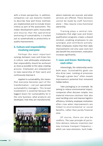 74with a Green perspective. In addition, companies can use maturity models to describe how well these methods are implemented and to include Green criteria as part of the assessment. This makes development paths measurable and ensures that the operational anchoring of sustainability is tracked just as systematically as productivity or quality improvements.6. Culture and responsibility: Involving everyonePe r ha p s t h e m o s t i m p o r t a nt synergy between Lean and Green lies in culture. Lean philosophy emphasizes that responsibility should be anchored as close as possible to the value-creating process. Employees are empowered to take ownership of their work and continuously improve it.Applied to sustainability, this means that everyone becomes part of the transformation – not just specialized sustainability managers. This broad involvement is essential because the biggest levers for sustainability lie in the core business: what products are developed, how they are manufactured, where materials are sourced, and what services are offered. These decisions cannot be made by staff functions alone – they require cross-functional ownership.Tr aining plays a centr al role. Companies that align Lean and Green qualification programs create a shared mindset, enabling employees to see synergies and contribute actively. When employees realize that their daily improvements not only save costs but also benefit the environment, motivation increases significantly.7. Lean and Green: Reinforcing each otherInterestingly, the relationship works both ways. Sustainability goals can also drive Lean. Looking at processes “through a green lens” often reveals improvement potential that remained hidden before.Take packaging as an example. By aiming to reduce environmental impact, companies often discover simpler, less material-intensive solutions that also save handling costs and improve logistics efficiency. Similarly, employee motivation often rises when improvements are linked to environmental or social benefits, rather than purely financial ones.O f c our s e, there c an als o b e conflicts. The Lean principle of just-intime delivery reduces inventory but may increase transport frequency – which can raise emissions. Such trade