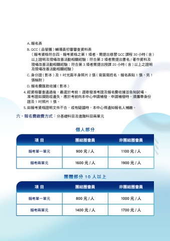A. 報名表B. QCC ( 品管圈 ) 輔導員初審審查資料表(報考資格符合四、報考資格之第 1 項者,需提出修習 QCC 課程 30 小時 ( 含 )以上證明及現場改善活動相關經驗;符合第 2 項者需提出書名 / 著作資料及現場改善活動相關經驗;符合第 3 項者需提出授課 20 小時 ( 含 ) 以上之證明及現場改善活動相關經驗)C. 身分證 ( 影本 ) 及 1 吋光面半身照片 2 張 ( 背面寫姓名,報名表貼 1 張,另 1張檢附 )D. 報名費匯款收據 ( 影本 )4. 經資格審查通過後,最遲於考前 1 週寄發准考證及報名費收據並告知試場。准考證如損毀或遺失,應於考前向本中心申請補發,申請補發時,須攜帶身份證及 1 吋照片 1 張。5. 如報考資格證明文件不合,或有疑議時,本中心得通知報名人補繳。六、報名費繳費方式:分基礎科目及進階科目兩單元項 目團結圈會員非團結圈會員報考單一單元800 元 / 人1000 元 / 人報考兩單元1400 元 / 人1700 元 / 人團體部分 10 人以上項 目團結圈會員非團結圈會員報考單一單元900 元 / 人1100 元 / 人報考兩單元1600 元 / 人1900 元 / 人個人部分