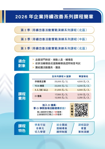 2026 年企業持續改善系列課程簡章第 2 季:持續改善活動實戰演練系列課程(北區)第 3 季:持續改善活動實戰演練系列課程(中區)第 3 季:持續改善活動實戰演練系列課程(北區)適合對象品質部門幹部、推動人員、輔導員欲參加輔導員或進階輔導員證照制度考試團結圈活動圈長、圈員課程費用全系列課程 6 堂課單堂報名非會員定價25,000 元/人4,500 元/人TCIA 會員22,000 元/人4,200 元/人3 人(含)以上21,000 元/人4,000 元/人CI 會員17,500 元/人3,150 元/人12,500 元/人2,250 元/人加入 CI 會員,享 CI 學院各項活動優惠折扣!個人會員享定價之7 折優惠;企業會員享定價之5 折優惠!結合團結圈輔導員證照制度課程設計著重實例演練學員可從各單元切入學習課程特色立刻報名
